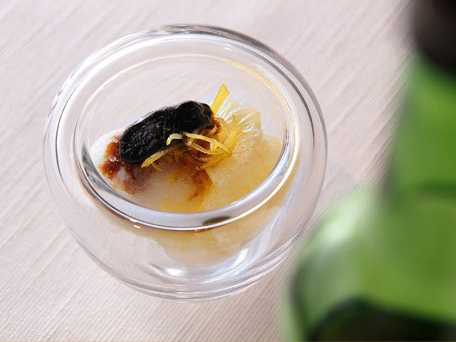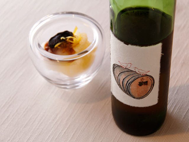 「ちょっと遊んでみました。この香り、黒にんにくっぽくないですか? あと、オレンジのコンフィチュールのような凝縮感も」と笑うコルビさん。たしかに、この貴醸酒は濃厚で複雑味があり、黒にんにくに通じる香りも。あと味にオレンジマーマレードのような風味があるので、このソルベと日向夏のピールに合います。