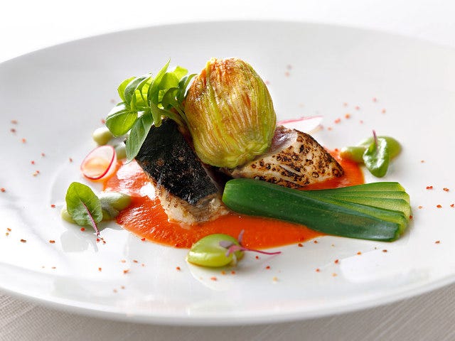 取材時に供された1品目は前菜の「鰆のたたき ラタトゥイユ添え」(写真上)。皮目を香ばしくあぶった鰆(サワラ)をお刺身のイメージで厚めにカットし、オマール海老の味噌が入ったトマトソースを敷いてあります。添えられた花ズッキーニの中にはラタトゥイユが入り、ソラ豆、キュウリ、バジルなどの野菜をあしらいます。ボリュームがありますがトマトの酸味がさわやかで、夏をイメージするひと皿です。