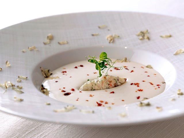 2品目は「豆乳と新玉ねぎの冷製ポタージュ」(写真上)。白一色でまとめた美しいスープで、ひと口味わうと玉ネギの甘みとうまみが口に広がります。使っているのは新玉ネギと豆乳だけ。一見、ヴィシソワーズのようですが、生クリームもジャガイモも加えていないため、あと味の軽さに驚きます。中央には海老のタルタルを添え、周りには削った昆布を散らしてあります。
