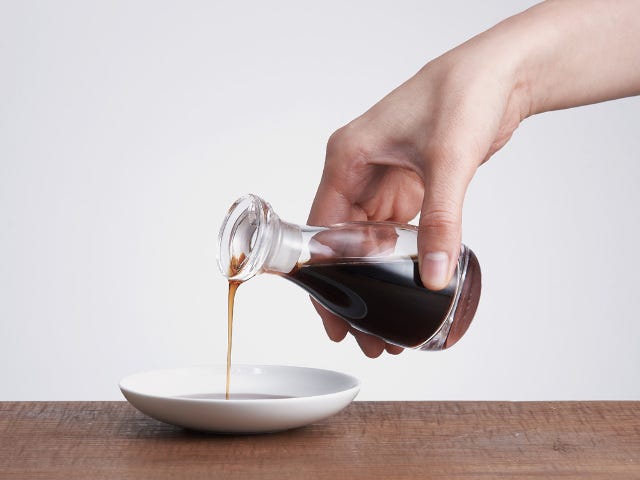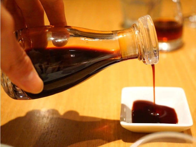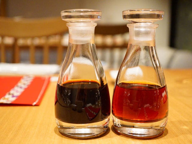 鈴木さんのスペシャルな発酵料理をいただく前に、本日の主役「ヒガシマル『特選丸大豆うすくちしょうゆ』」(写真上・右)と「ヤマア『阿波屋五年熟成醤油』」(同・左)を食べ比べようと「THE醤油差し」を手に取り注いでみると……