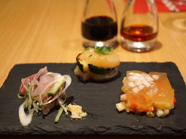 醤油のうまみをダイレクトに感じられる前菜「熊本県産いさきとアジの混ぜ造り」(写真上・左)には、熟成醤油でねっとり濃厚に演出。隠し味に日本最古の発酵食・フナ鮨の粕が施された「ホタテとズッキーニのミルフィーユ」(同・中央)は、独特な酸をホタテの甘みがまろやかに包み込む。酒粕やぬか漬けした発酵野菜を閉じ込めた「夏野菜の煮こごり」(同・右)は、うすくち醤油に支えられてだしのうまみのハーモニーを奏でる。
