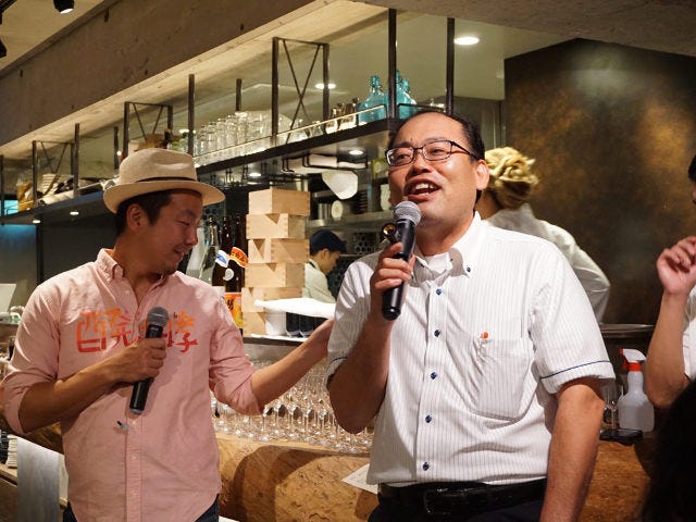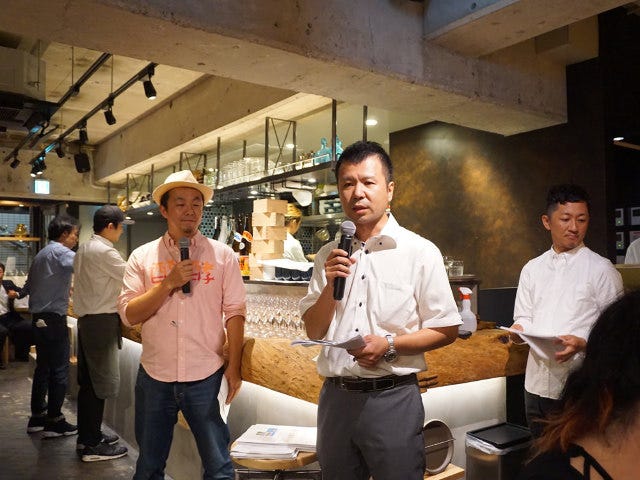 「当店は、発酵・無添加・手作りをモットーに、店の入口にある酒樽のなかで育てた手作りの米麹を使って醸した肉や魚、野菜料理、甘酒などを提供する発酵料理専門店です。そして、もう一つのコンセプトは“生産者と仲が良い”ということ。本日は、日頃からお世話になっている方々とお客様をつなぐ架け橋となるべく、兵庫県・熊本県・東京都から3名のスペシャリストをお招きしております!」。同店で料理長を務める鈴木大輝さんのアナウンスとともに、食前酒が注がれる。