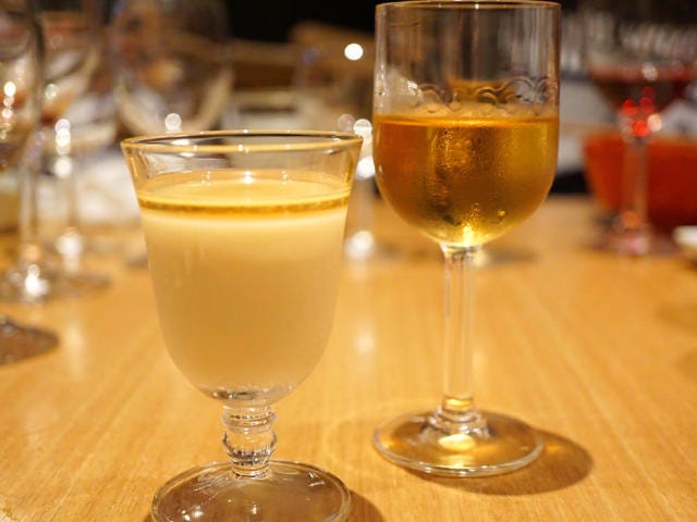 花の蜜のように濃厚なデザートに合わせて、米を一切磨かずに作られた玄米酒「岡村本家 金亀 赤」(写真上)をひと口。貴腐ワインを想像させる上品な味わいとフレッシュな柑橘香が、糀の甘みをキリッと引き締めてくれる。