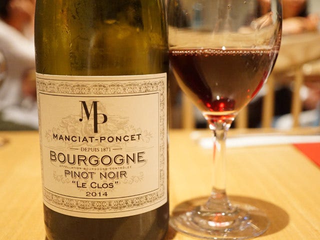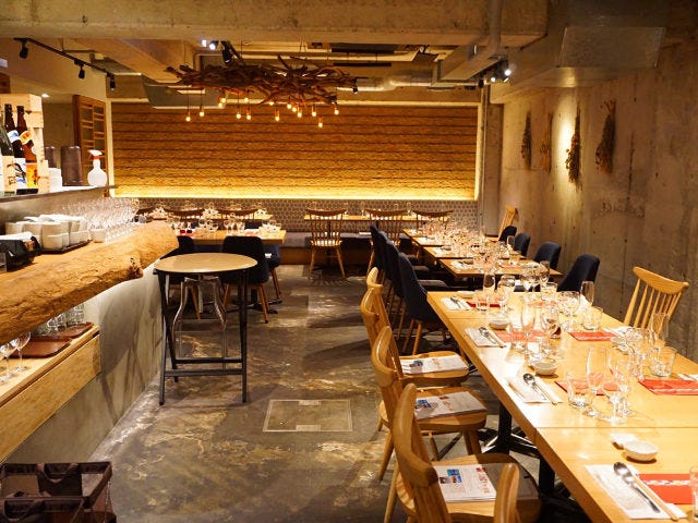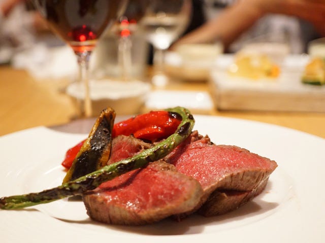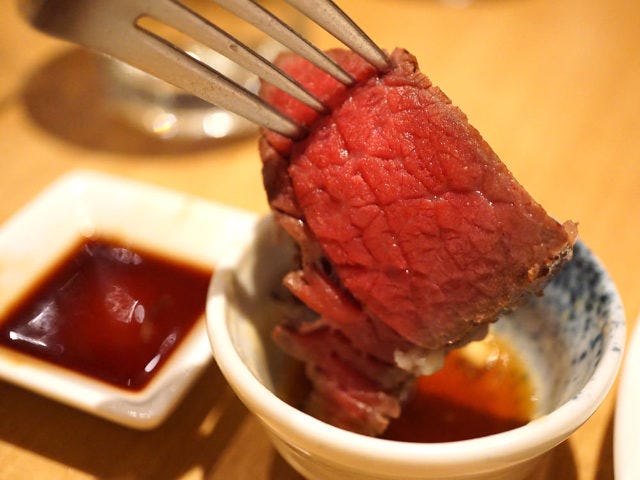 「マンシア・ポンセ ブルゴーニュ・ピノ・ワール・レ・クロ」(写真上)は、すっきりとした酸が心地よい。「発酵牛が食べていたエサに合わせて、有機栽培のブドウで作られた赤ワインを選びました」と話すのは、同店で店長兼ソムリエを務める高木豊さん。食べごたえのある厚切りビーフと茶目っ気溢れるペアリングが、お客の胃袋を一気に満たす。