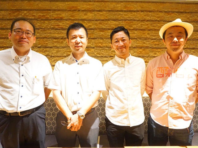 日本の3大調味料の一つである醤油に親しみをもってもらいたいと集まったのは、写真左からヒガシマル醤油株式会社の研究所で醸造開発を務める農学博士の眞岸範浩さん、松合食品株式会社・取締役工場長の大橋旭さん、そして世界一美しい「THE 醤油差し」を開発したTHE株式会社・代表取締役社長の米津雄介さん。“醗酵”の文字を胸に刻んで登壇する鈴木さん(写真右)の姿に、優しい笑みが店内に広がる。