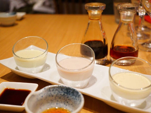 驚くなかれ、垂れることなくスーッと胴体へ帰っていく。見たことのない美しい様相に驚嘆するのも束の間、先付け「湯河原の老舗とうふ・生ゆば専門店『十二庵』の豆乳で作られた3種の豆腐」(写真下)が、パステルカラーにグラスを染める。