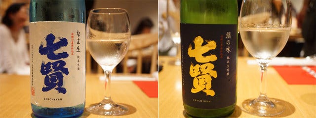 続く日本酒は、「七賢 純米生酒 なま生」(写真上・左)と「七賢 純米大吟醸 絹の味」(同・右)。「さらりと飲みやすい七賢は、バリエーション豊かな前菜の五味を邪魔することなく、魚介のうまみを広げてくれるんです」と鈴木さん。