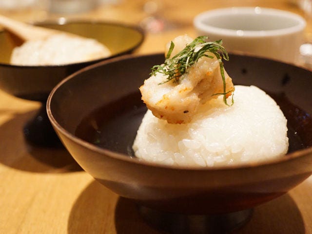 〆のご飯「兵庫県産ハモの麹漬け焼きお茶漬け」(写真上)は、琵琶湖の郷土食であるフナ鮨のお茶漬けをオマージュしたもの。粘り気に富む米は、ハモの香ばしさとうまみを抱き、淡いだしを泳いで、さらに醤油のうまみを滲ませる。添えてあるのは、フナ鮨の粕。ひと口つまむと、乳酸菌のパワフル酸が身体中に刺激を運ぶ。