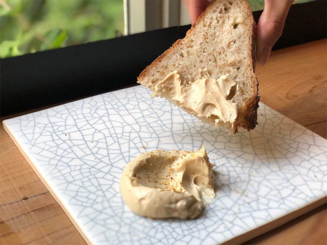 2皿目は「徳島の小麦で作ったパンと味噌バター」(写真上)。毎朝土鍋で焼きあげるパン「サワードゥ」は、外はカリッと中はモチモチの食感。そのまま食べて酸味を楽しんだら、「味噌バター」をたっぷりつけていただこう。