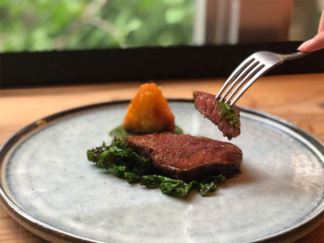 添えられているのは、甘みが特徴的なじゃがいものおにぎりと、パリッと香ばしく焼きあげたケール。牛肉とともに楽しめば、十二分にそのおいしさを味わうことができる。