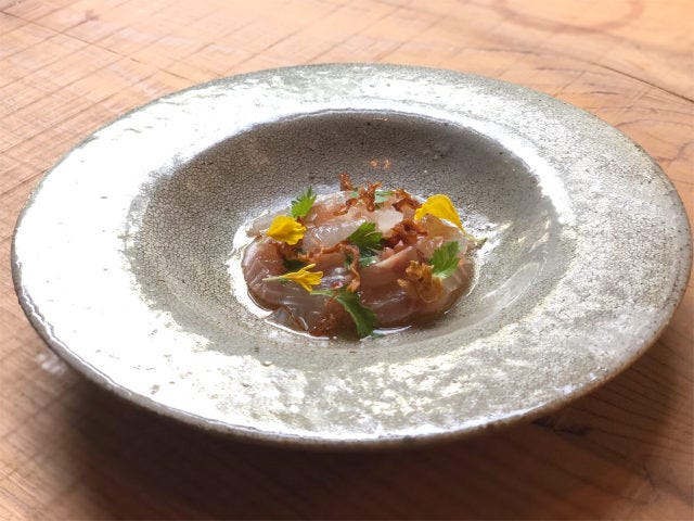 1皿目は、新鮮な徳島県産のスズキの「刺身」(写真上)。しかし、ただの刺身ではない。『TurnTable』の刺身は、ジョーダン氏の遊び心が光る、目でも舌でも楽しめる華やかな一品だ。