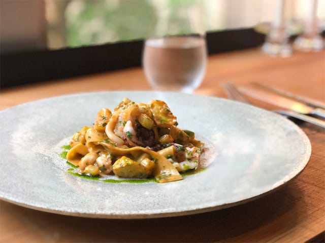 毎朝手打ちで仕込んでいるモチモチのタリアテッレを、濃厚なトマトソースとバジルで和えている。そこにアオリイカ、緑と黄色2種類のズッキーニをトッピング。小ぶりにカットされた具材はソースや麺とよく絡み、そのおいしさにフォークが止まらなくなる。
