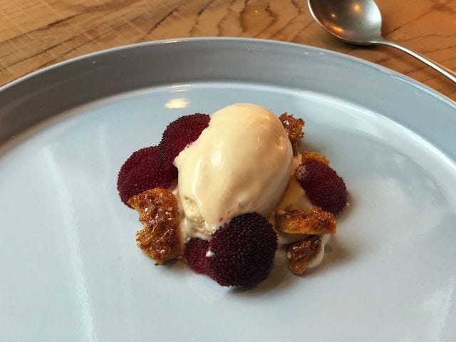 この日のデザートは、徳島県産のヤマモモを使ったアイスクリーム。スモモ、和三盆(わさんぼん:徳島県特産の砂糖で、高級和菓子の原料としてよく使用される)、酢で味付けをしたシンプルなアイスクリームに、フレッシュなヤマモモとカリッと仕上げたハニカムクッキーをトッピング。