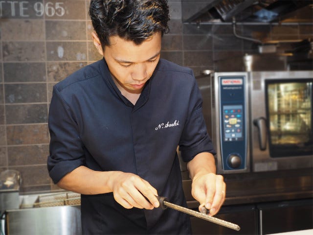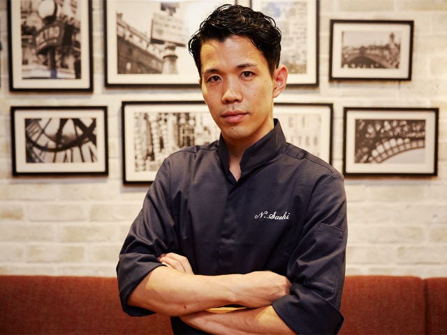 シェフの佐伯亘彦さん(写真上)は、「ザ・リッツ・カールトン大阪」のメインダイニングであり、『ミシュランガイド京都・大阪 2018』で一つ星に輝いたフランス料理店『La Baie(ラ・ベ)』で10年のあいだ腕をふるってきた実力派。また、その間フランスへ飛び、西仏の国境をまたぐ美食の地・バスクと、ワインの名産地フランス・ブルゴーニュ地方で修業をした経験も持つ。