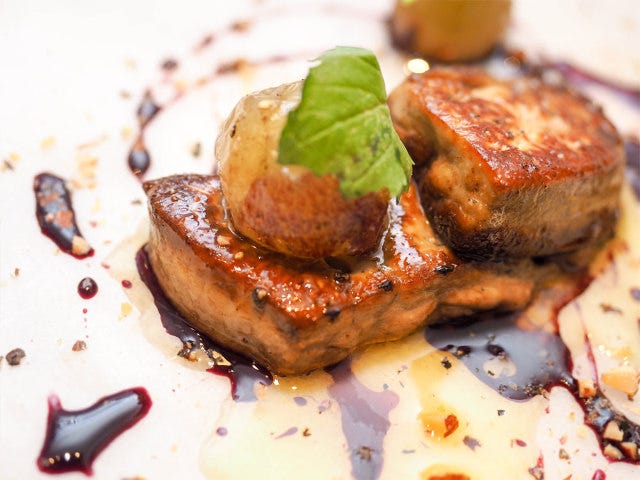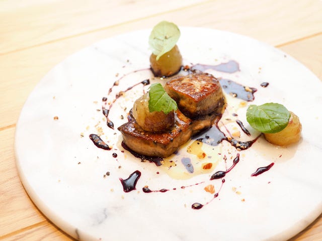 「フォワグラと巨峰」(写真上)は、旬の巨峰を添え、独特の甘みとコクを持つポートワインのソースで仕上げている。フォワグラというと濃厚なイメージがあるかもしれないが、フレッシュな巨峰と合わせることでさっぱりと食べられる。