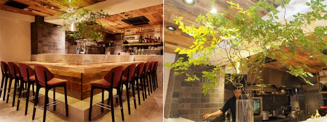 店内は、木を中心に大理石や漆喰などの素材をミックスしたナチュラル・モダンなインテリア。大きな鏡や観葉植物、計算された照明の配置により、地下なのに気持ちのよい陽光が差しているかのよう。Lの字に配された幅広カウンターからはシェフのテキパキとした仕事ぶりが伺え、会話も楽しめる。