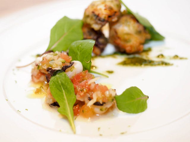 奥に見えるのは、アオサ海苔の衣で軽くサクッと揚げたタコのベニエだ。バジルのソースと合わせてどちらもさわやかにいただける。