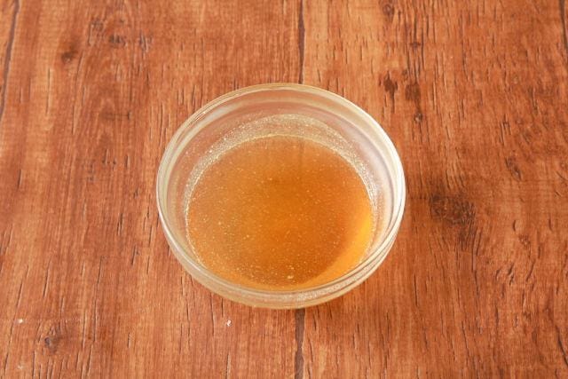 ① 耐熱ボウルに水を入れ、粉ゼラチンをふりいれる。600Wの電子レンジで50秒ほど加熱して粉ゼラチンを溶かしたら、コンソメの素を加えて溶かす。粗熱がとれたら冷蔵庫で冷やしかためる(約90分)。