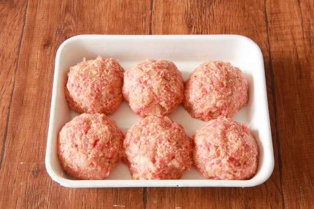 ⑤ 6等分にする。手にサラダ油(分量外、適量)を塗り、肉だねを両手で交互にキャッチボールをするようにして中の空気を抜きながら厚さ3cmの俵型に成形する。冷蔵庫に入れ、30分おく。
