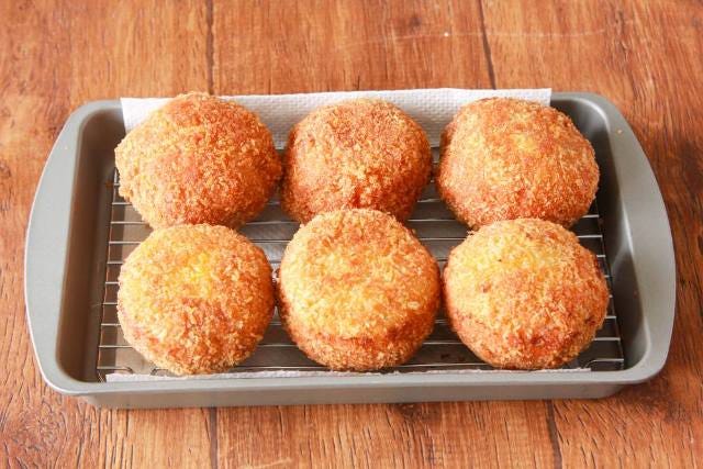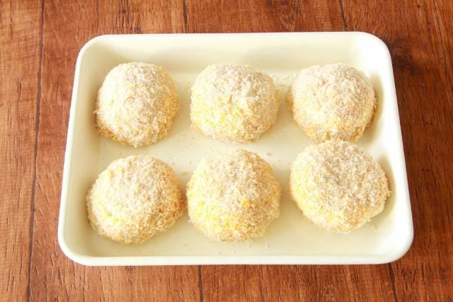 小麦粉→溶き卵→パン粉の順につけたら、再び溶き卵→パン粉の順につける。