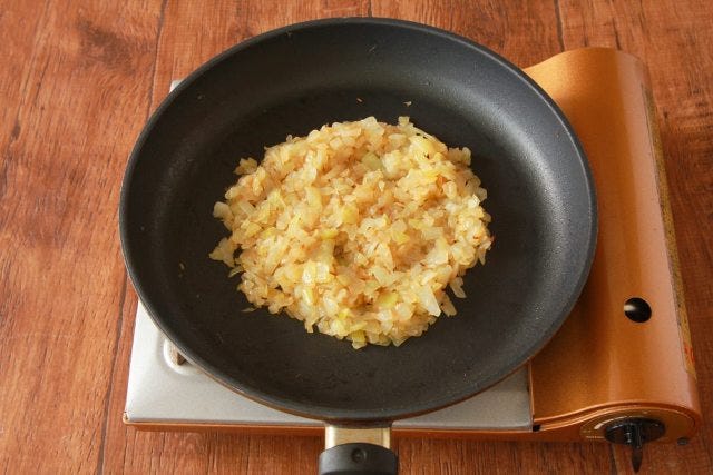 ③ フライパンにこめ油(または、なたね油)を引いて中火で熱し、タマネギをきつね色になるまで炒め(約40分)、粗熱をとる。