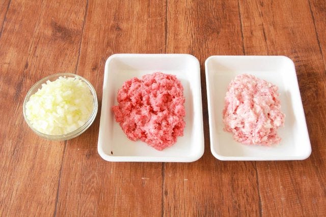 ② タマネギはみじん切りにする。牛モモ肉、豚ロース肉はひと口サイズに切ってから粗みじん切りにする。※あれば、フードプロセッサーを使うと簡単。