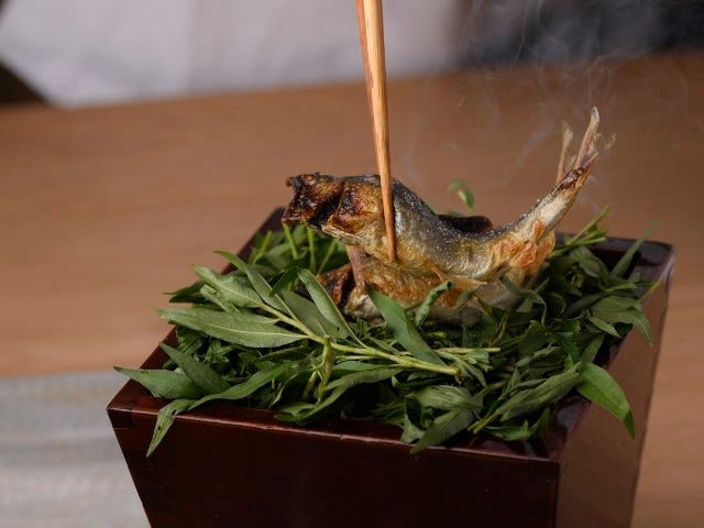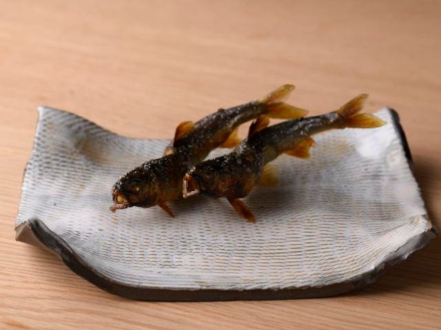 長野県・天竜川の上流を泳ぐ鮎は、肝に全く雑味がない。理由は意外にもそのルックスからうかがえた。「小顔だけど、身はふっくらとしているでしょう。これは、栄養価が高くて新鮮なコケをたべて育った証拠なんです」と常安さん。良質なコケを貪欲に求め泳いだグルメな鮎は、脂ののりが良く、ほどけるほどに口当たりが軽い。