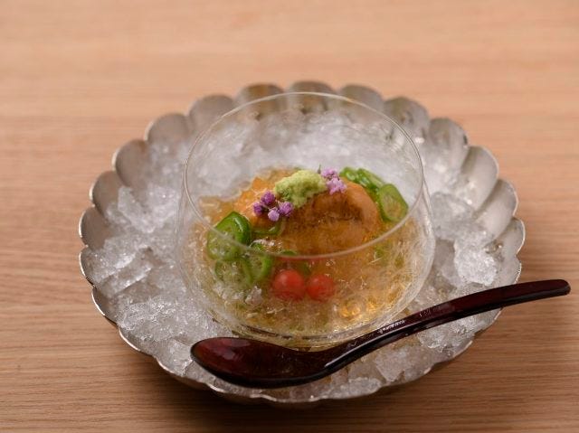 こだわりの無添加ウニは、青森県大畑産。その身の厚さに、言葉もでない。甘くなめらかな口どけの奥から、寒天によせられた長芋がシャリシャリと涼やかな音を立てる。そこにオクラのとろみ、マイクロトマトのフレッシュさが加わって、柔らかくもハッキリとした食感の妙が完成する。