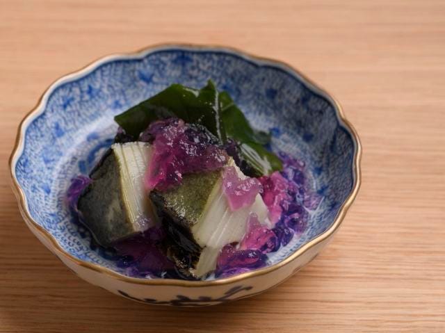 透き通った赤紫色の正体は、金時草を煮出しただしをゼリーで固めたもの。みずみずしい食感のおひたしは、噛むほどにぬめり気が口内をコーティングする。