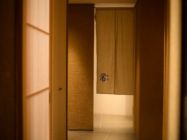 地図の指す場所は、西麻布の交差点からほど近い路地裏。コンクリート打ち放しがスタイリッシュなビルの2階に、『常(とわ)』は今春オープンした。目印となるのは、行灯のみ。