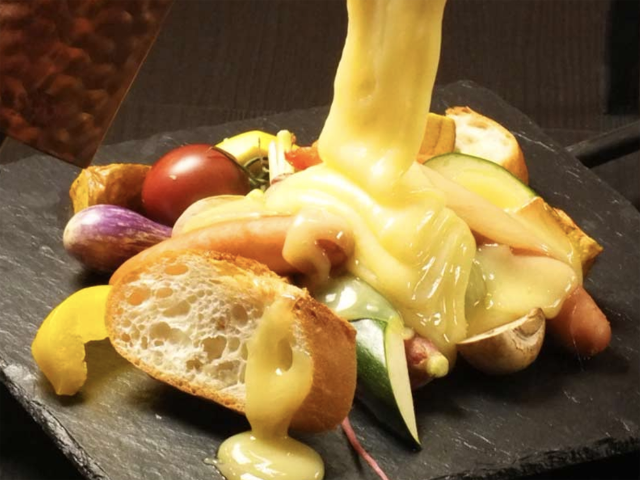 また、アツアツをとろ~りと目の前でかけるパフォーマンスが人気の「ラクレットチーズ」(写真上)も『花畑牧場』から直送。こちらを目当てに通うお客もいるほどの人気メニューだという。