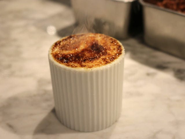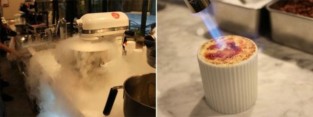 新鮮なミルクをはじめとする原料を攪拌(かくはん)したところに、冷たい白煙がもくもくする液体窒素を使って作り上げていく。出来上がりを器にギュッと詰め、仕上げに素早くキャラメリゼ。スプーンですくうと、未だかつて体験したことのないクレームブリュレ! 冷たくて、なめらかで、口に含むとスーッととろけてしまう。