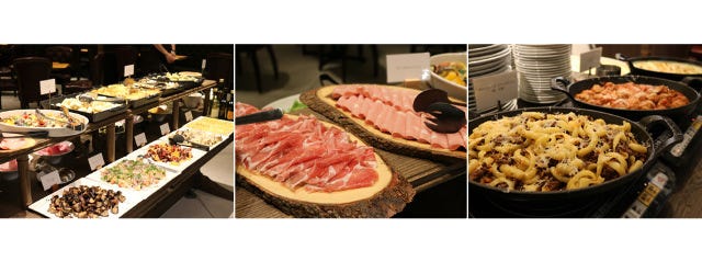 1つ目の柱は、大きいテーブルにイタリアの郷土料理15種類、新鮮な野菜15種類が並ぶビュッフェ形式の食べ放題だ。