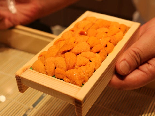 この日の自慢は、北海道から届いたばかりの根室産ウニ。「小粒だけれど、甘みがとても深いんですよ」と、目の前に立つ、北海道からやってきた板前さんが見せてくれる(写真上)。