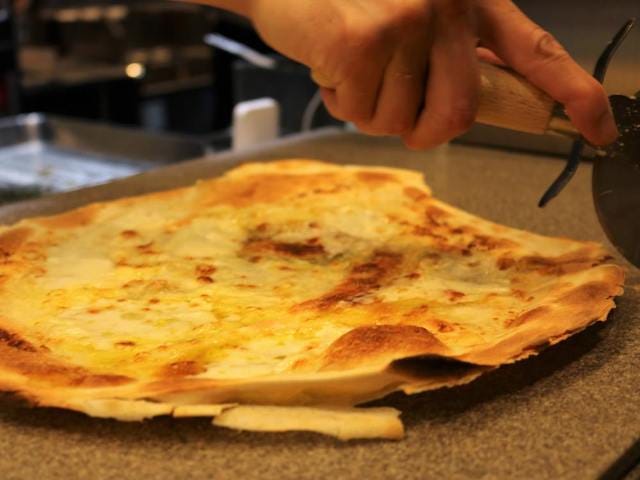 焼きたての熱々は、テーブルに準備される石の天板上へ運ばれ、目の前でカット。ふちはパリパリ、中心に近くなるにつれチーズとオリーブオイルがしみて、しっとり。1枚でめくるめく変わる食感を楽しめるというわけだ。