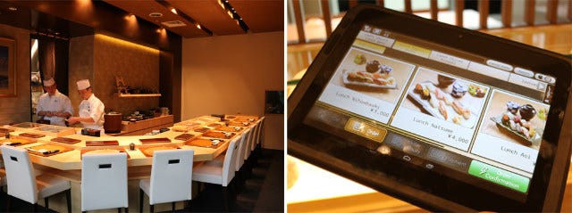 店内奥の正面に設置されたL字のカウンターは広々していて、気さくな板前さんたちがにこやかに迎えてくれる。カウンターの他にテーブル席や個室もあり、さらに、外国人客にもわかりやすくメニューの内容を伝えるため英語と中国語のタッチパネル(写真上・右)も用意されている。