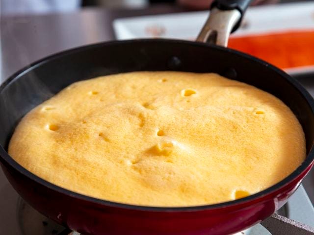 もう一皿、絶対に頼みたい定番メニューはこちらの卵料理。割烹の卵料理と言えばだし巻き卵だが、こちらでは洋食の技術を使い、卵をスフレに仕立てた。まず卵白のみをメレンゲ状に泡立てた後、卵黄と合わせて火にかける。