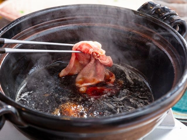 さっぱりとした甘みのある割り下を土鍋で煮たて、和牛をさっとくぐらせて、レアな部分を残しながら器に盛り付け。