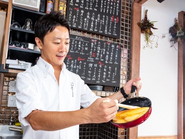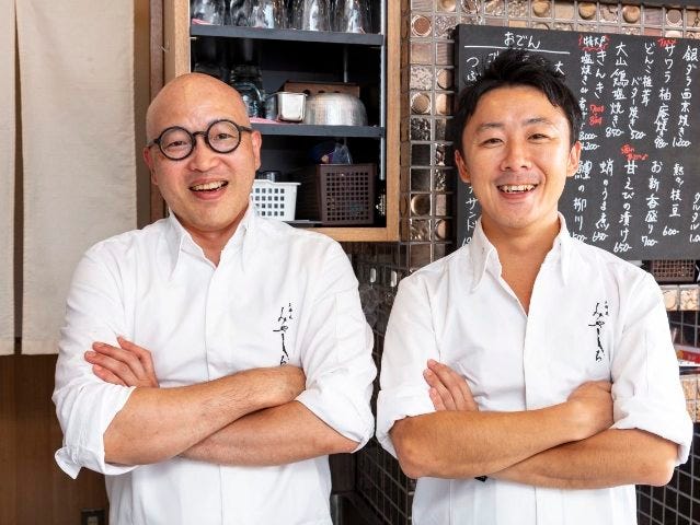 「築100年の民家をリノベーションして、オープンしました。1階はこだわり食材を使用するカウンターのみの天ぷら店『天婦羅 みやしろ』、2階は『くずし割烹 おにかい』として二業態で営業しています。1階はコースで2万円~ですが、2階はカジュアルに割烹料理を食べられる店で、1階『みやしろ』で出している食材の一部もリーズナブルに提供しています」と、店長の猿山浩之さん(写真上・右)
