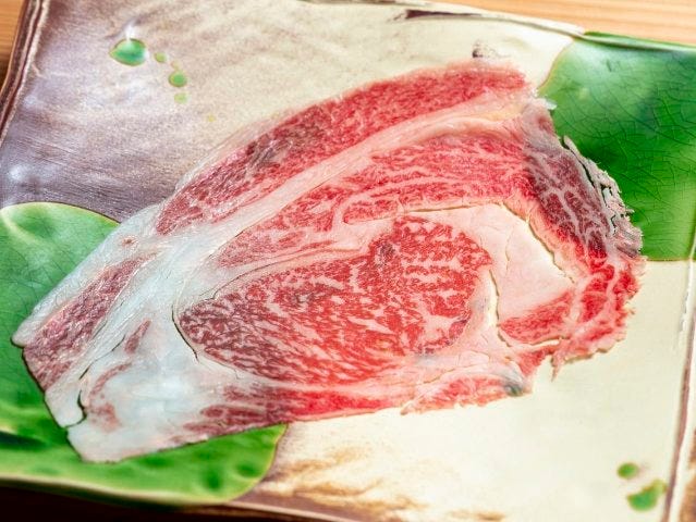 人気の「牛すきonうに」は、和牛のリブロースを1枚贅沢に使った一品。こちらの料理は注文が入ってから、目の前のカウンターで作られる。