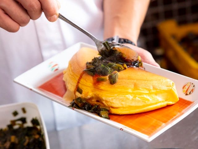 ふわっふわのスフレが完成したら、お皿に盛り付け。ワクワクしっぱなしだ。この料理名は、確かメニュー名にニラ玉とあったはず。どこにニラが入るのだろうと期待に胸が膨らむ。