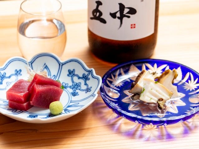 また、『天婦羅 みやしろ』で提供している素材を使った料理も登場する。築地市場から仕入れるこだわりの刺身を2階でも提供しているのだ。この日は、ボストン産のまぐろと6時間ほどかけてじっくりと煮た京都の煮あわびが登場していた。刺身は日替わりで6種類ほど提供しているので、メニューが書かれた黒板をチェックしたい。お酒は季節ごとにおいしい日本酒を仕入れ、他にも焼酎やサワー、ワインなども用意している。