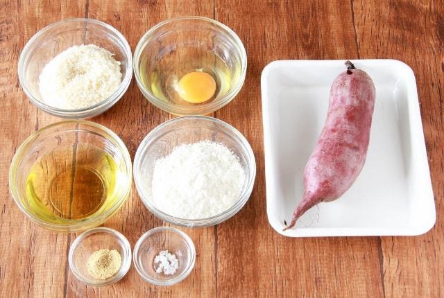 普通のコロッケはつぶしてから形成する作業が必要だが、ふかし芋を厚めに輪切りにして衣をつけて揚げることで、さつまいもをそのまま楽しめるコロッケになる。