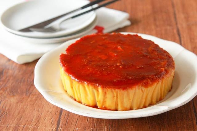 ② 小鍋に砂糖と水を入れて砂糖を溶かし、中火で熱して濃い茶色になったら火を止め熱湯を加えて混ぜ、とろみがつくまで煮詰める。型に流し入れ、冷蔵庫で冷やす。