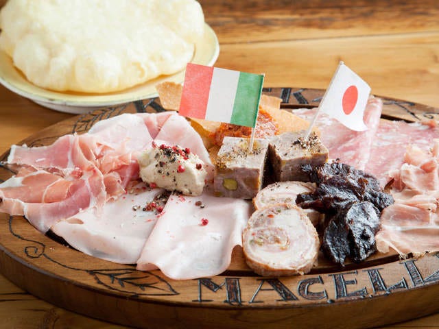 「イタリア半分、日本半分」と名付けられたシャルキュトリーメニューは、生ハムやサラミといった肉加工品について、イタリア産・日本産の両方をひと皿に並べて提供するユニークなスタイル。しっとりしてうまみの深いイタリア、フレッシュでまろやかな日本と、どちらの良さも楽しむことができる。