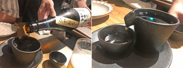 日本酒を入れた片口(かたくち:酒などをそそぐ注器)は、満杯になるとあふれる。盃を下に置いておけば、自動的に盃を満たす遊び心にあふれた演出が楽しい。