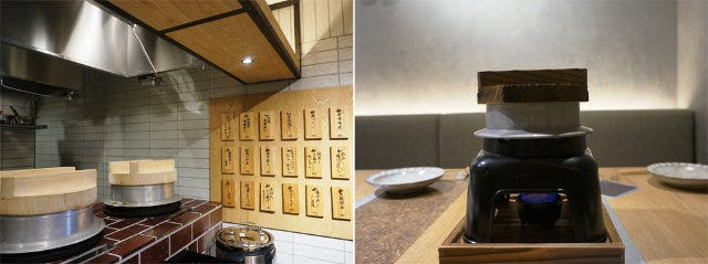 夜は、「つどつど炊き上げる釜炊きご飯」(同・右)というメニュー名で卓上用の小型羽釜で炊き上げたものが楽しめ、こちらも人気を博している。