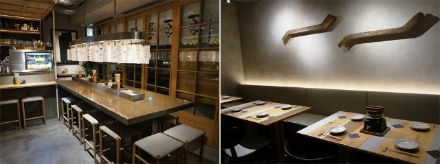 キッチン前カウンター(写真上)では、厳選された食材を炭火で焼き上げる様子や、ずらりと並べられたおばんざいを眺めながら食事やお酒を楽しめる。40席しかないのに、それ以上の広がりを感じさせる空間デザインだ。