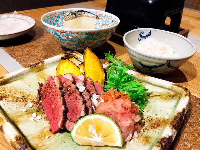 ランチタイムでは、あじフライや炭焼きの豚や魚の主菜1品に、自家製すくい豆腐、京のおばんざい1種、否否三杯オリジナルブレンド米の白ご飯、具だくさんの味噌汁付きの定食などを提供している。