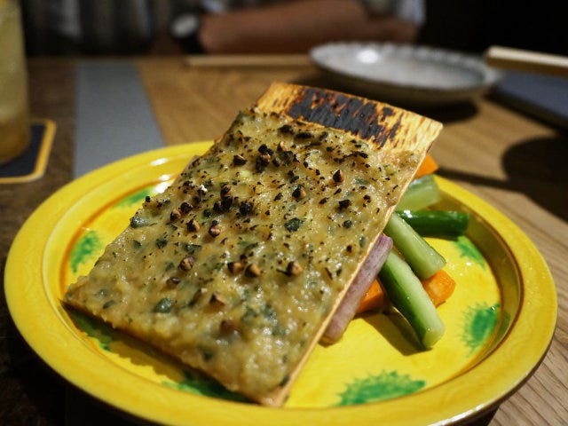 「炙り香味味噌」(写真上)は、白味噌、粒味噌にミョウガ、シソ、ショウガ、ネギ、松の実などを刻んだものを混ぜ、杉板に塗り軽く焼いている。添えの生野菜にディップしてもいいが、なめ味噌(食品として食べる味噌)にすると日本酒の肴にぴったりだ。